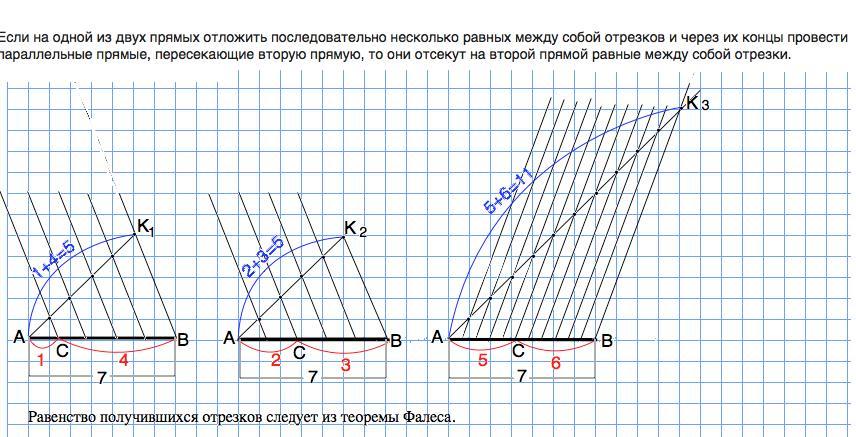 в) аналогично на проведенном луче отложим 5+6=11 равных частей, и отрезок АВ делится на 11 равных частей.