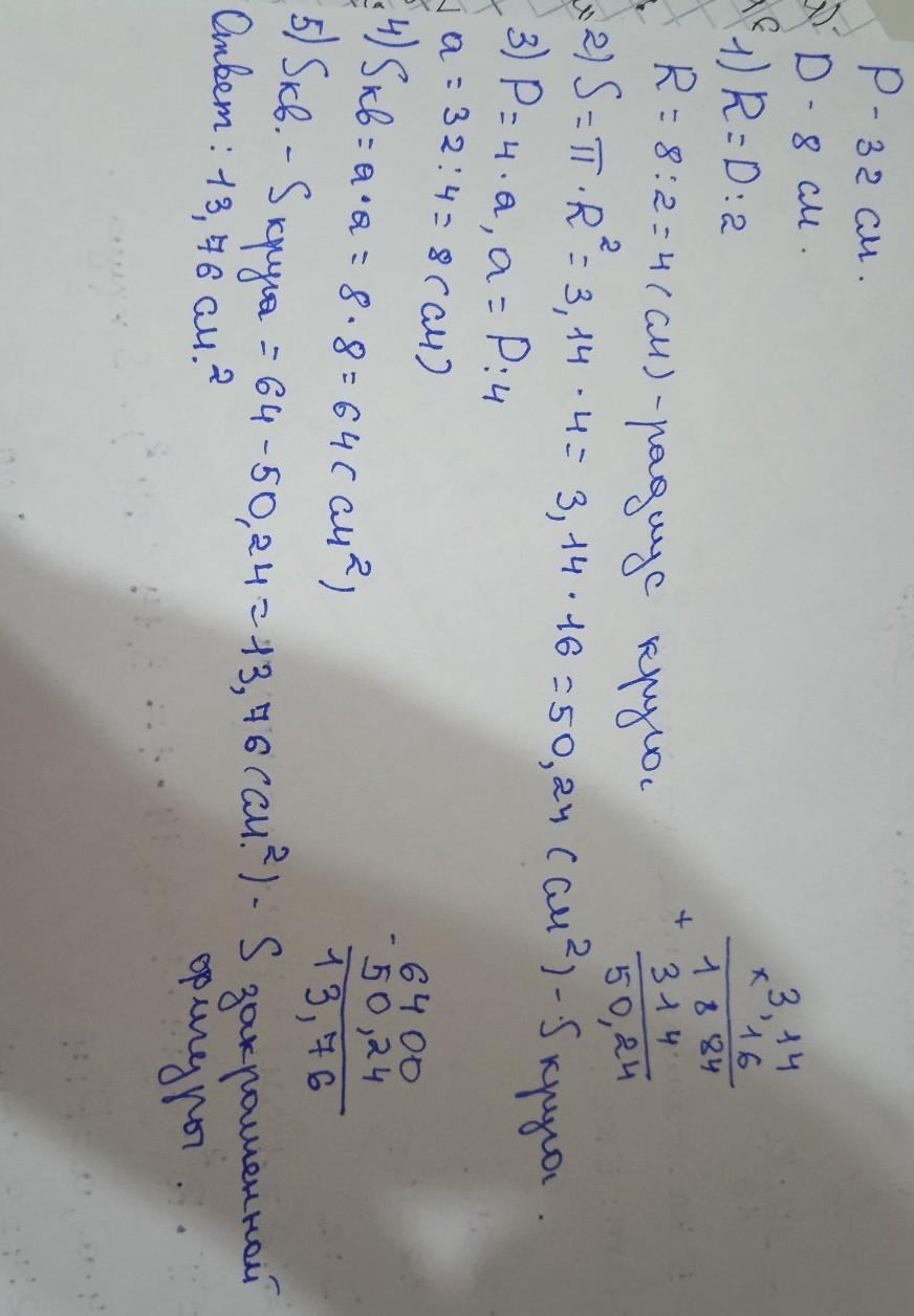 Вычислите площадь закрашенно части фигуры, если периметр квадрата 32см, а диаметр круга равен 8 см (π=3,14)