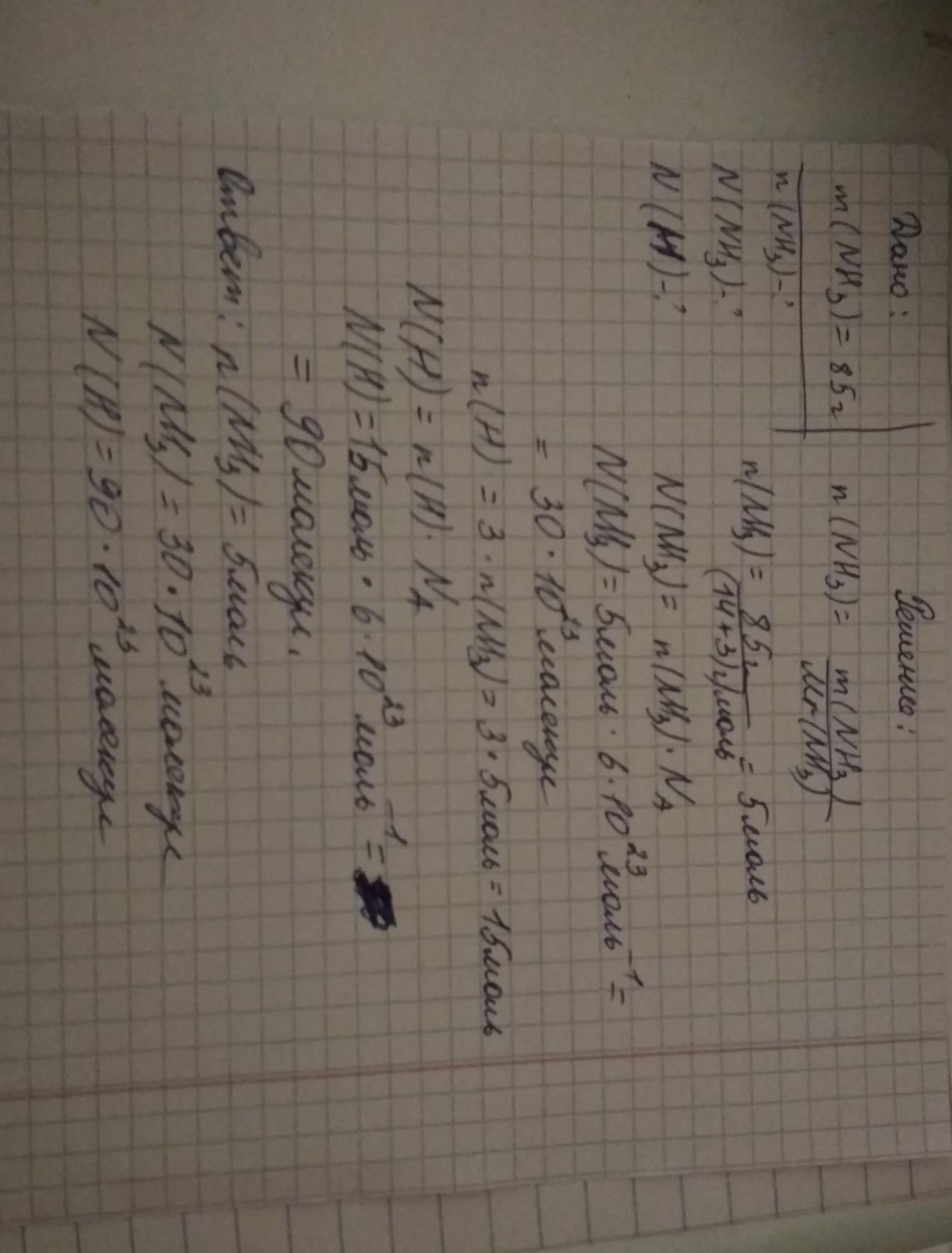Вычислите количество вещества, содержащегося в 85 г аммиака y NH3. Сколько молекул содержится в этом образце аммиака? Сколько атомов водорода содержится в этом образце аммиака?