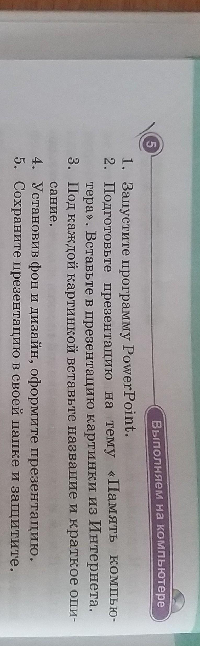 1. Запустите программу PowerPoint. 2. Подготовьте презентацию на тему «Память компью- тера». Вставьте в презентацию картинки из Интернета. 3. Под каждой картинкой вставьте название и краткое опи- сание. 4. Установив фон и дизайн, оформите презентацию. 5. Сохраните презентацию в своей папке и защитите.