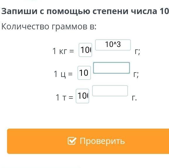 Запиши с помощью степени числа 10. Количество граммов в: 1 кг = г; 1 ц = г; 1 т = г.