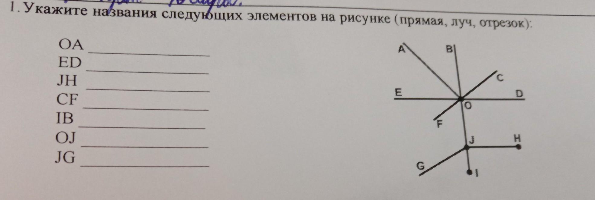 ОА луч ЕD прямая JH отрезок СF прямая IB прямая OJ отрезок JG луч