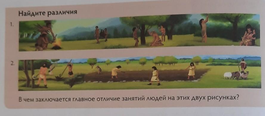 На первом рисунке люди не занимались земледелием, а на втором занимались земледелием. На первом рисунке люди не разводили скот, а на втором разводили. На этих двух рисунках разное время жизни предков)
