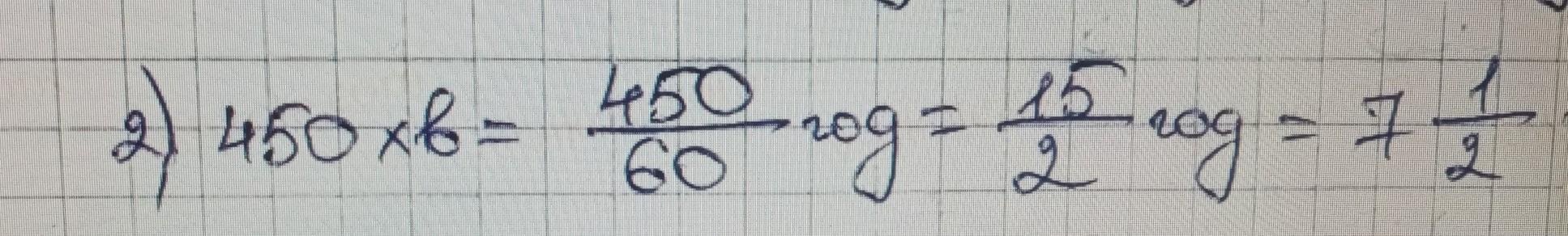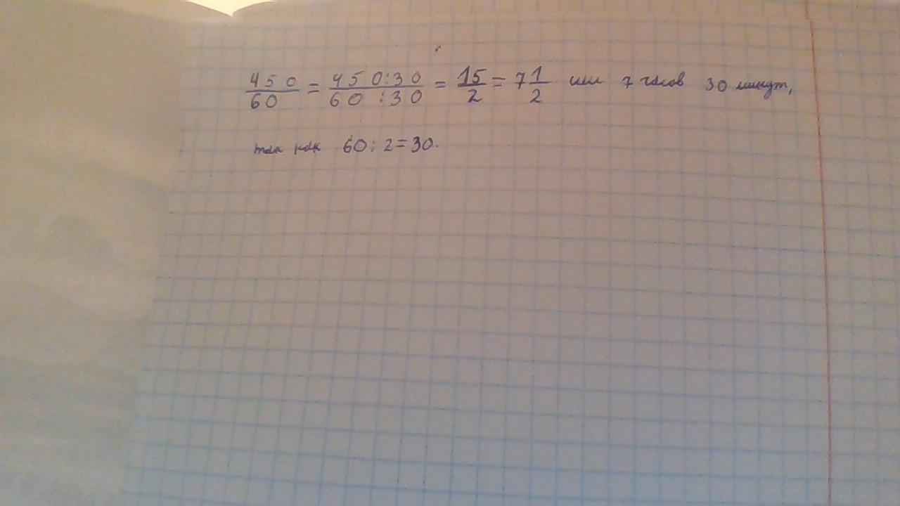 сначала что бы узнать сколько часов в 450 минут, 450 поделили на 1 час, но не на 1 , а на 60 минут, потому что 450 это тоже минуты. Там написано сначала дробью, потому что это всё равно что поделить, но там не поделили, а сократили, ну то есть 450 делиться на 30 и 60 делиться на 30 ( выбирается самое большое число, на которое можно поделить и числитель, и знаменатель (чисельник, знаменник на укр.). Ну и потом мы делим 15 на 2 и пишем целое число которое выходит, то есть 7, но 7 умножить на 2 будет 14, поэтому отнимаем 15 минус 14 выходит один и выходит такой поэтому результат. Надеюсь более менее понятно объяснила, если что-то не понятно, спрашивай.