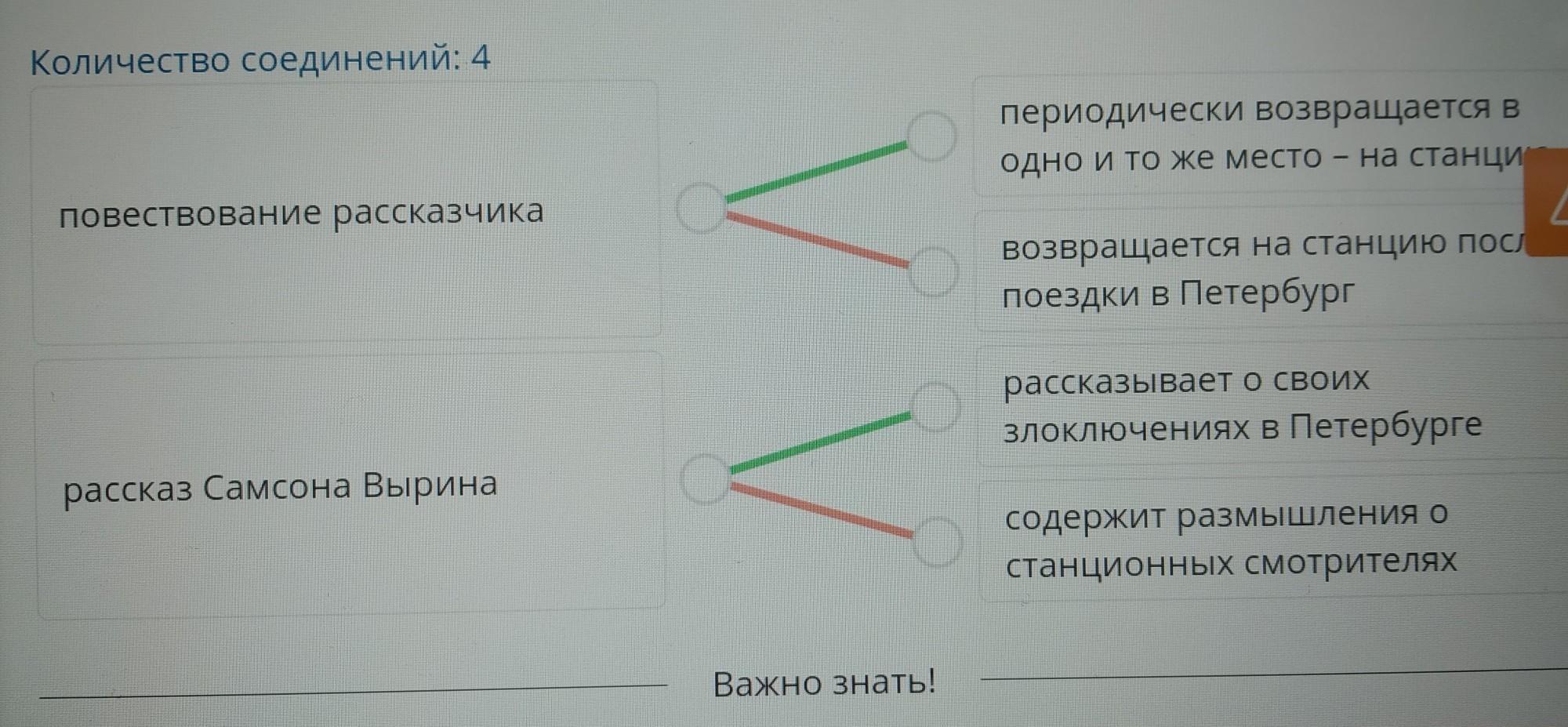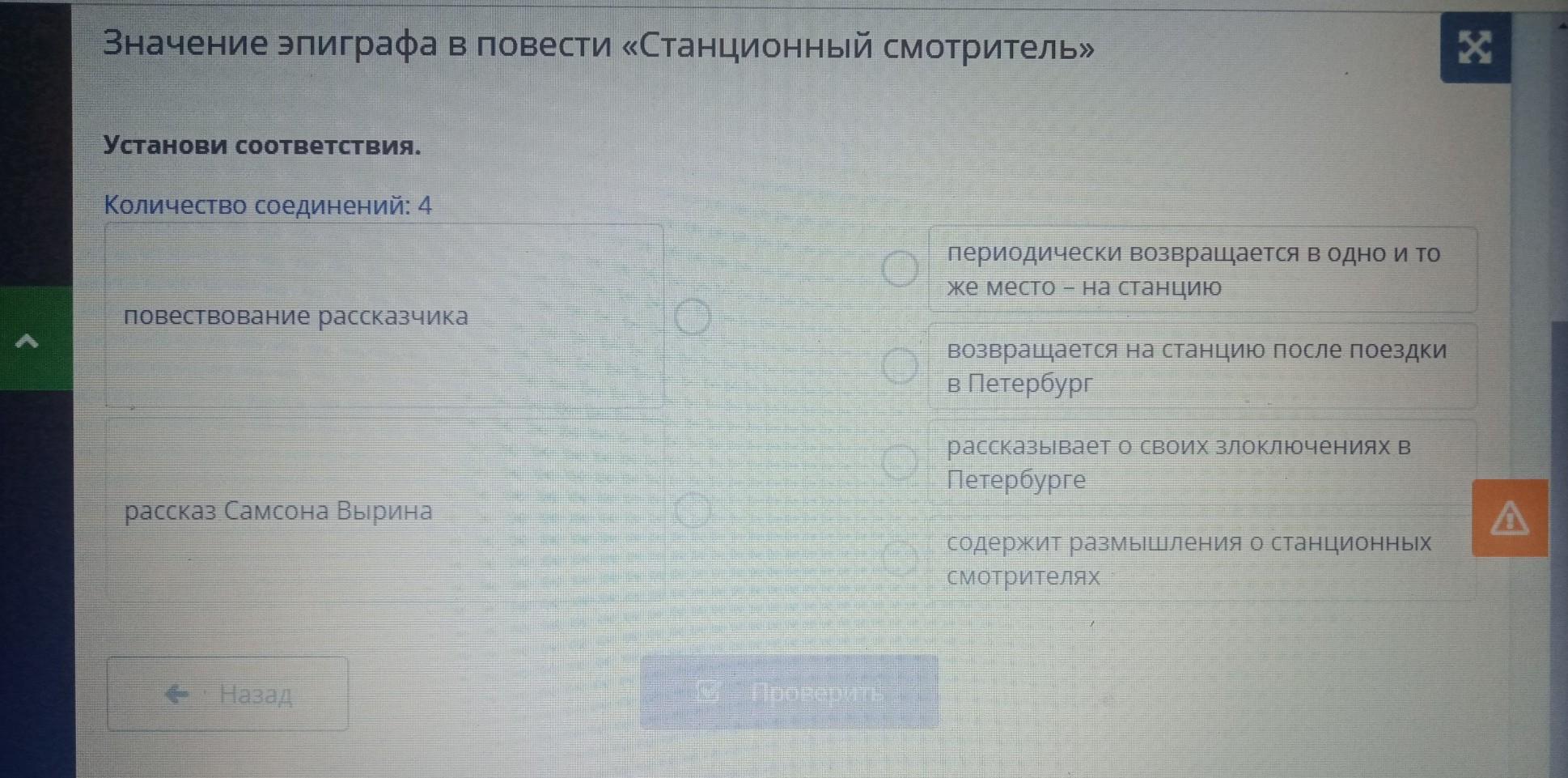 Значение эпиграфа в повести «Станционный смотритель» х Установи соответствия. Количество соединений: 4 периодически возвращается в одно и то же место на станцию повествование рассказчика Ф возвращается на станцию после поездки в Петербург рассказывает о своих злоключениях В Петербурге рассказ Самсона Вырина A содержит размышления о станционных Смотрителях - Назад Проверить