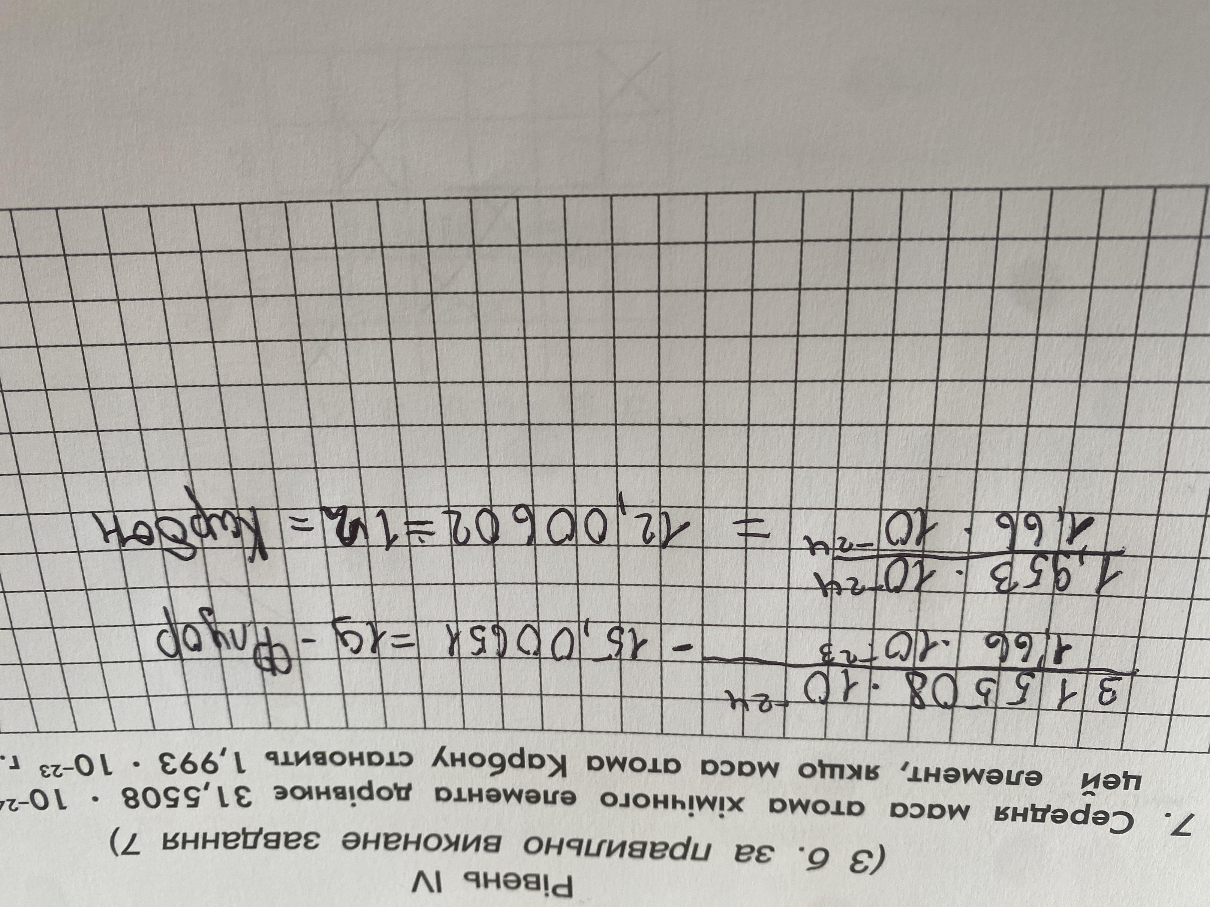 7. Середня маса атома хімічного елемента дорівнює 31,5508 . 10-24 г. Визнач цей елемент, якщо маса атома Карбону становить 1,993 . 10-23 г.