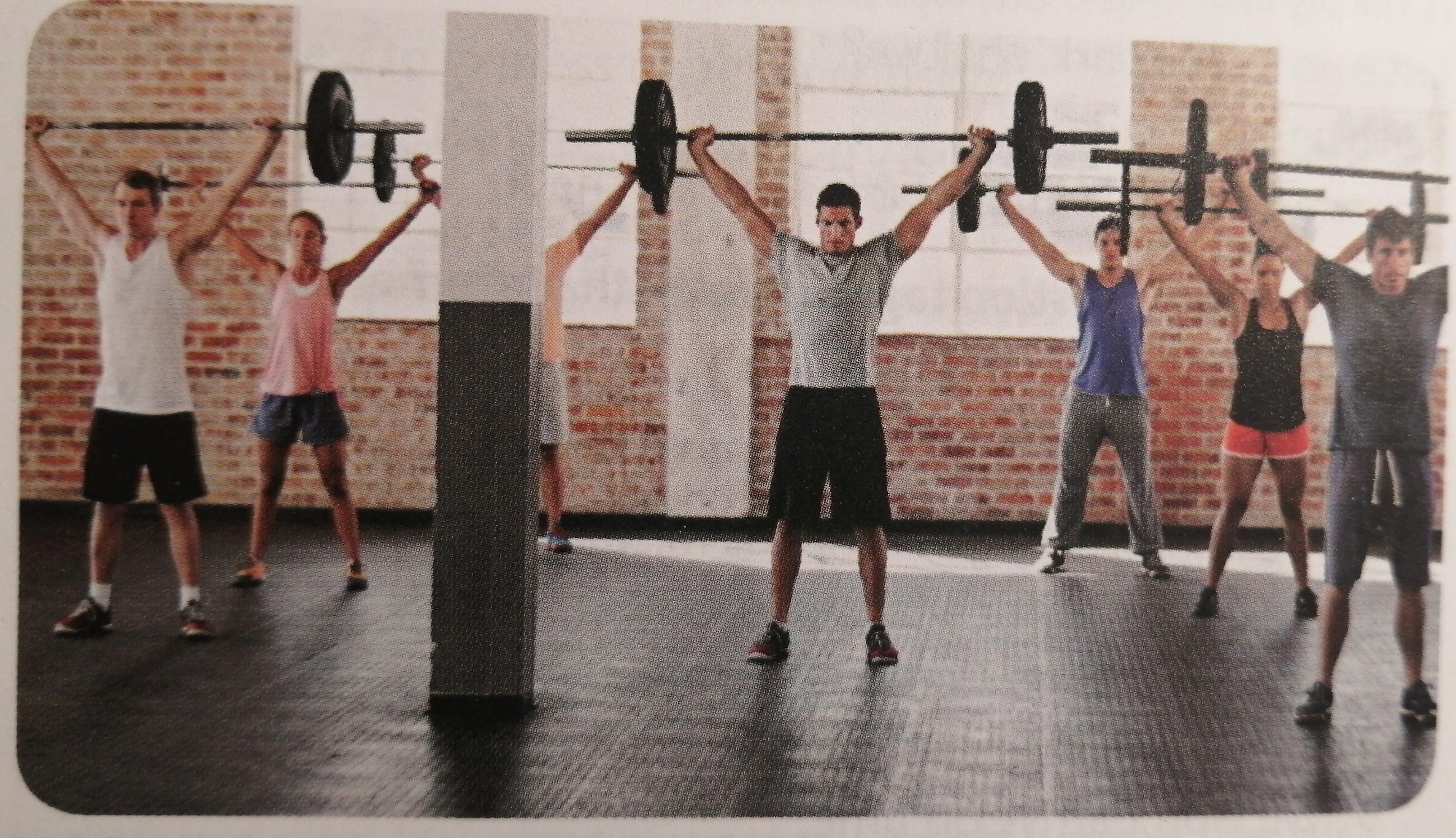 On the picture we see a group of people, which are holding the barbell. This group mostly contains men. On the background we see a brick wall with white windows, and some columns between them. As it is a sports hall, or maybe a gym, we can imagine that there are even more people holding the barbells. The people are all very strong, but we can still see, how hard this is. However, they are all in spots uniform, which helps them keep comfortable during the training. In my opinion, they are all very well trained, that’s why it’s not to hard for them. Anyway, they are very strong, even though this isn’t to hard for them.