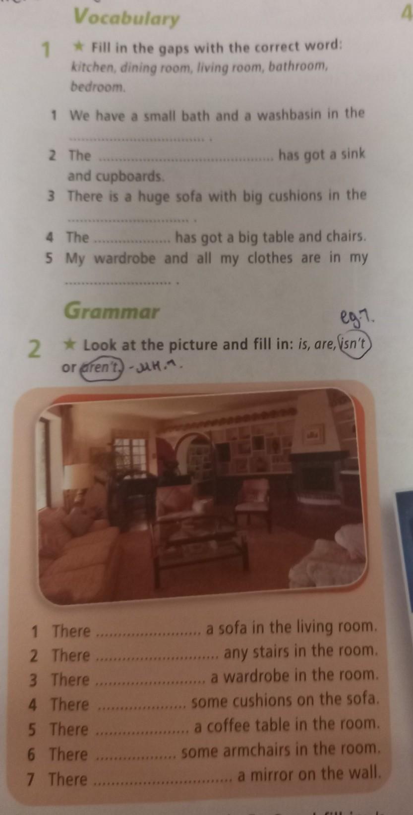 There isn't (по идее правильно должно быть: There is no wardrobe....) a wardrobe in the room (на картинке нет шкафа).
