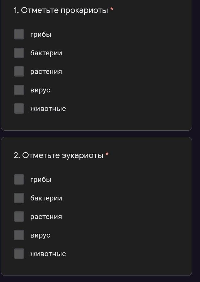 прокариоты:бактерии, а эукариоты животные, растения и грибы.Вирусы это отдельная группа которая отличается от прокариотов и эукариотов.