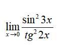 lim(x->0) sin² 3x / tg² 2x = lim(x->0) 9/9x² * sin² 3x * 4x² /4* tg² 2x = lim(x->0) 9 * sin² 3x / 9x² * 4x²/tg² 2x *1/4 = lim(x->0) 9/4 * (sin 3x/3x)² * (2x/tg 2x)² = 9/4 * 1² * 1² = 9/4