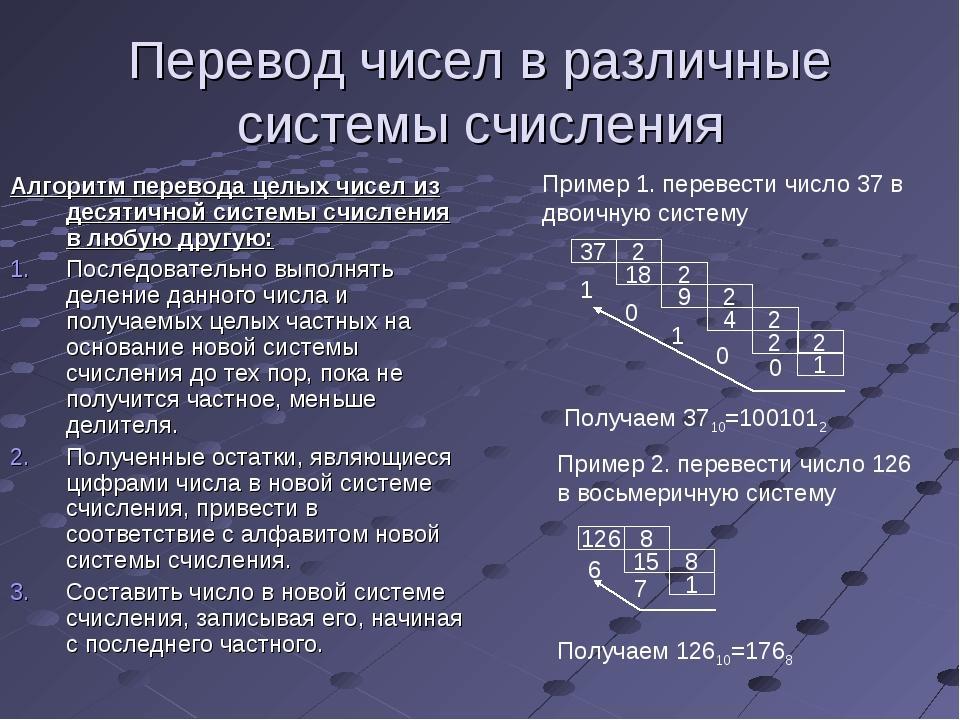 Для перевода из десятичной в любую другую систему всё наоборот, тут нужно делить. Объяснить мне это будет сложнее, поэтому прикреплю картинку. (№2).