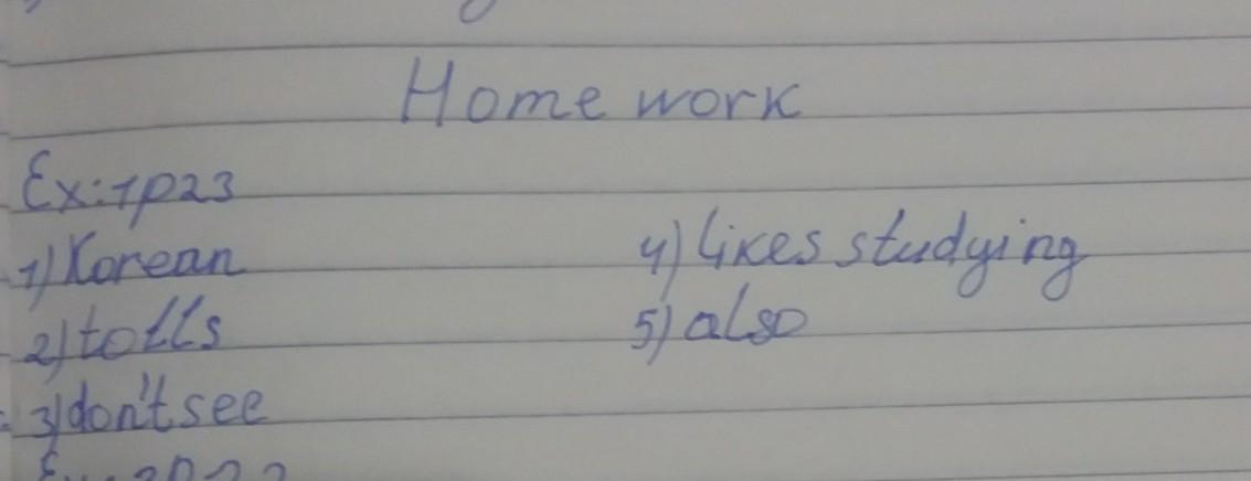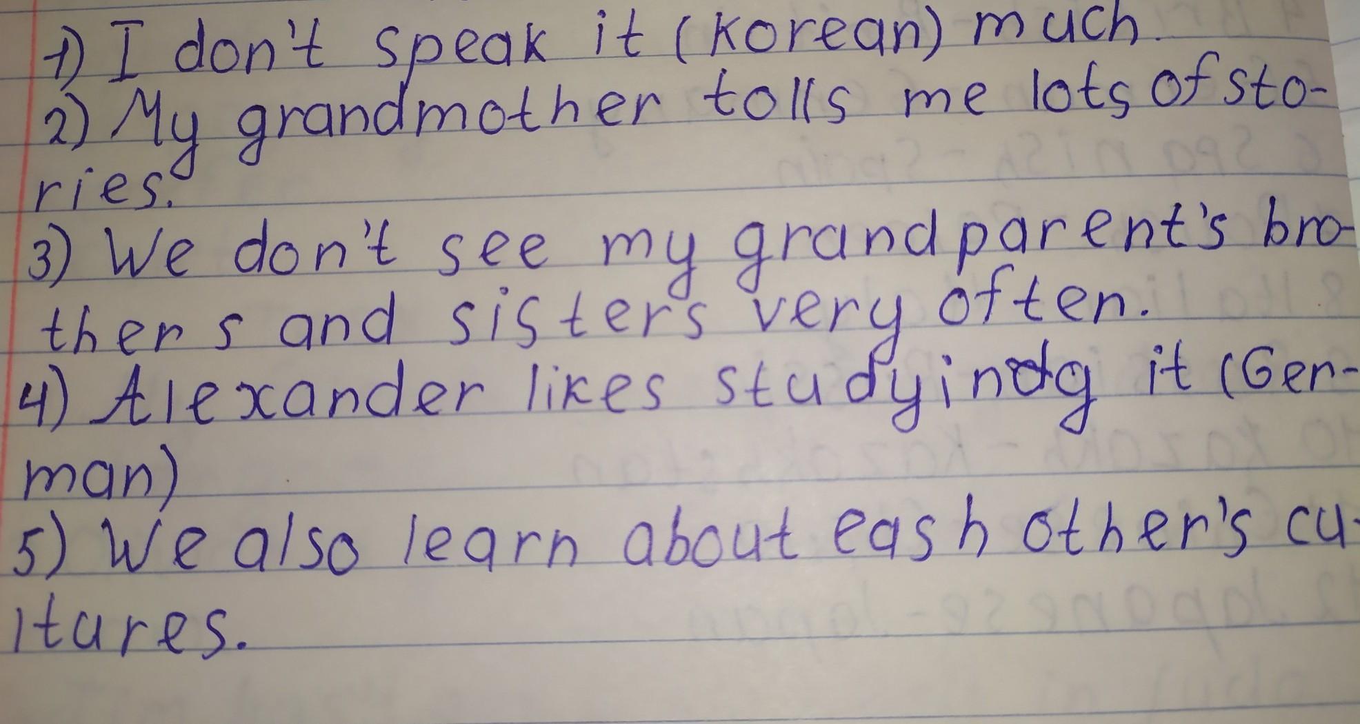 1 Complete the examples using information from the text on page 22. Then choose the correct answers in rules 1-3. My grandparents come from Russia. 1?_it (Korean) much. My grandmother?_ me lots of stories. Wes_ my grandparents' brothers and sisters very often. Alexander 4 _ it (German). We 5_ learn about each other's cultures.