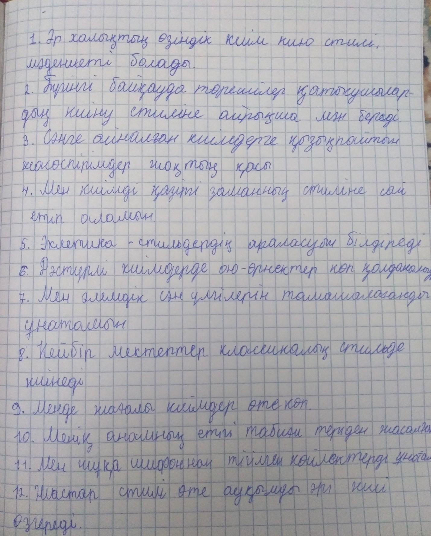 9-тапсырма. Берілген сөздерді пайдаланып, сөйлем құра. Киім кию, киіну стилі, сәнге айналған, қазіргі заманғы стиль, жағалы киім, табиғи тері, жұқа шифон, жібек мата, теңізші эклектика, дәстүрлі киім, әлемдік сән үлгісі, классикалық стилі, жастар стилі.