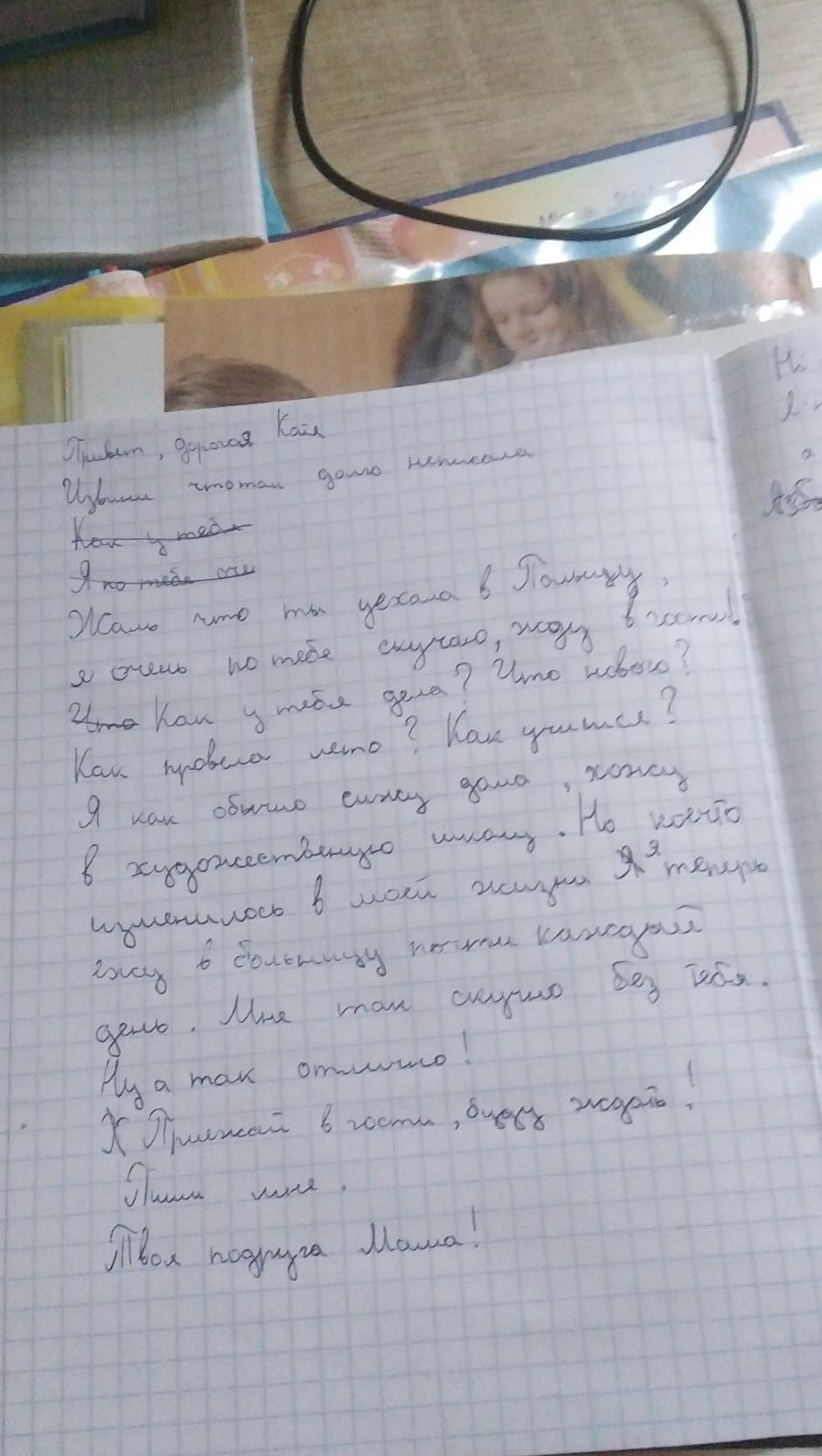 Hello dear Katya! Sorry for not writing for so long. It's a pity that you left for Poland, I miss you very much, I look forward to visiting! How are you? What's new ? How did you spend your summer? How do you study? I sit at home as usual, go to art school, but something has changed in my life, now I go to the hospital almost every day. I’m bored there without you. Well, so great! Come visit, I'll wait! Write to me! Your friend Masha!