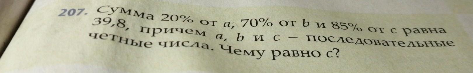 По условию сумма 20% от а, 70% от b и 85% от с равна 39,8.