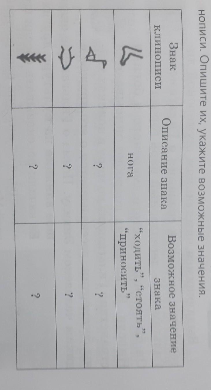 101. Игра "Расшифруйте". Изучите таблицу. В шумерском письме знак "ноги" имел зна- чения "ходить", "стоять", "приносить". Расшифруйте знаки кли - нописи. Опишите их, укажите возможные значения.