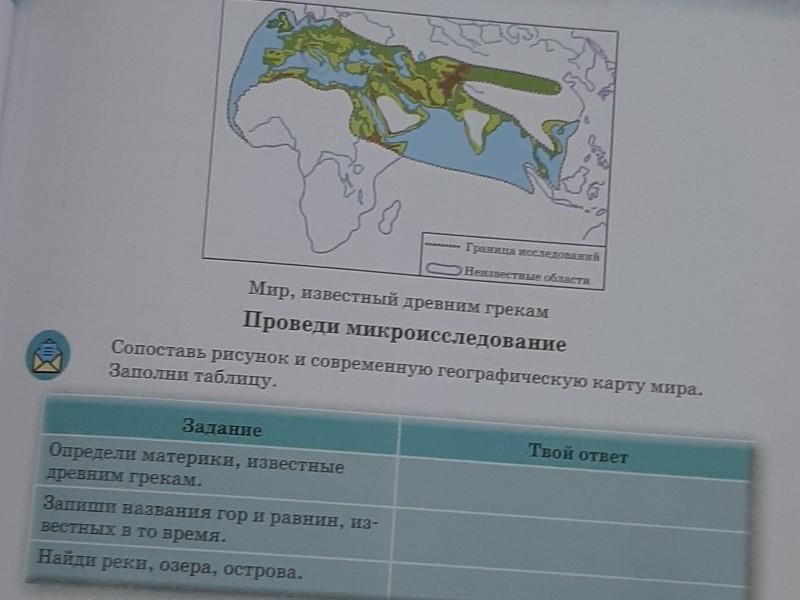 Сопоставь рисунок и современную географическую карту мира. Заполни таблицу. Задание Твой ответ Определи материки, известные древним грекам. Запиши названия гор и равнин, из- вестных в то время. Найди реки, озера, острова.