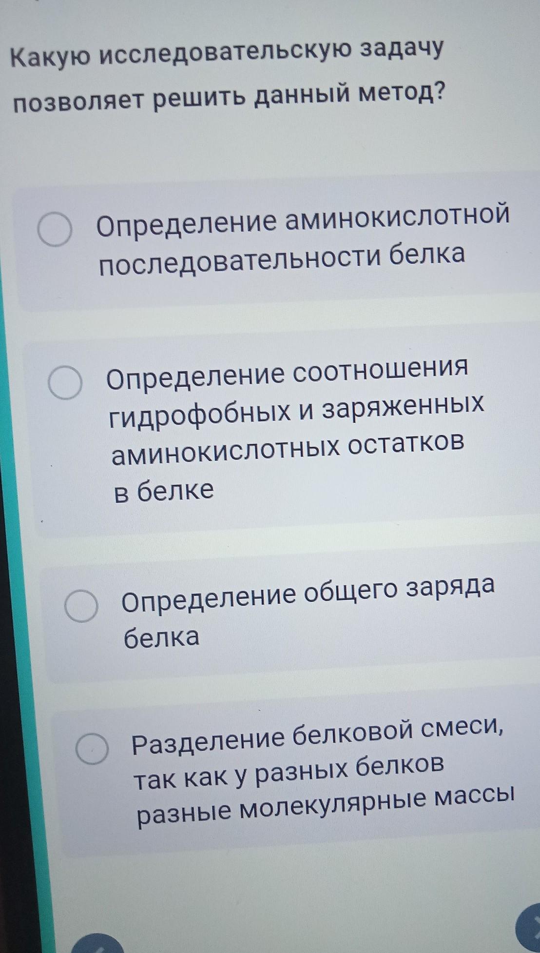 Известно, что при электрофоретическом разделении белков иногда используют додецилсульфат натрия (SDS) - ионный детергент. Перед электрофорезом белковый препарат кипятят с SDS, в результате чего молекулы белка приобретают отрицательный заряд по всей длине, Какую исследовательскую задачу позволяет решить данный метод?