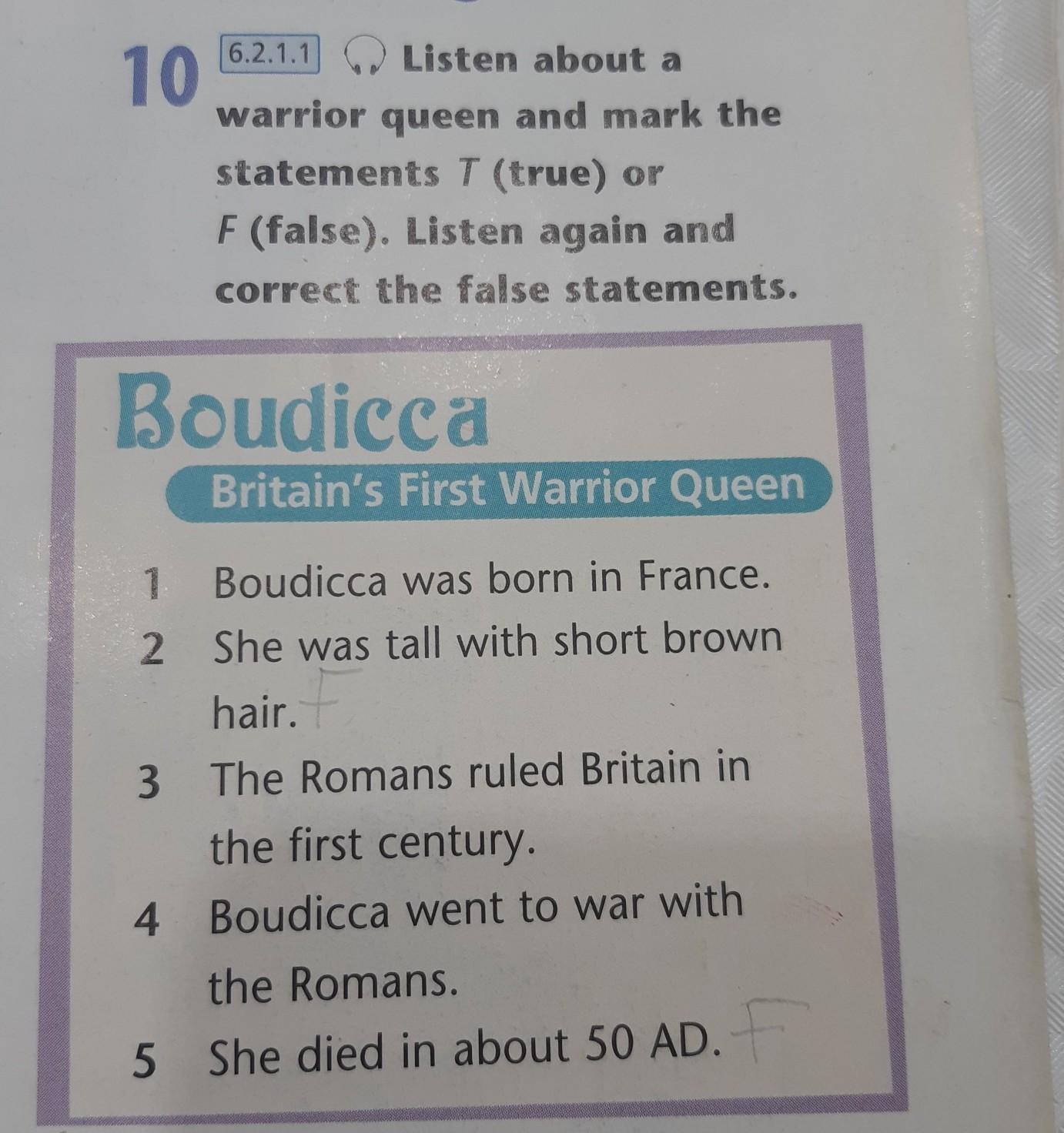 6.2.1.1 Listen about a 10. warrior queen and mark the statements T (true) or F (false). Listen again and correct the false statements. Boudicca Britain's First Warrior Queen 1 Boudicca was born in France. 2 She was tall with short brown hair. 3 The Romans ruled Britain in the first century. 4. Boudicca went to war with the Romans. 5 She died in about 50 AD.