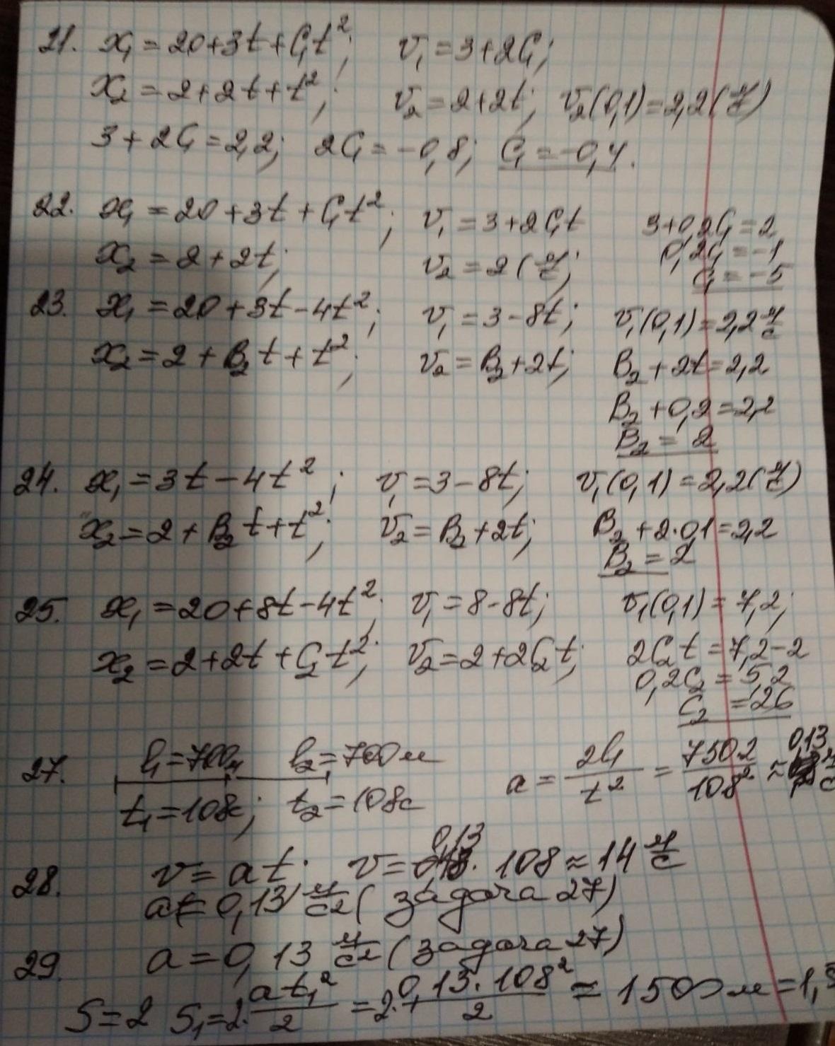 21. Движения двух точек определяются уравнениями х1 = A1 + B1t + С1t2 и х2 = A2 + B2t + С2t2, где А1 = 20 м, В1 = 3 м / с, А2 = 2 м; В2 = 2 м / с, С2 = 1 м / с2. Через время t = 0,1 с точки приобрели одинаковой скорости. Найти коэффициент С1.