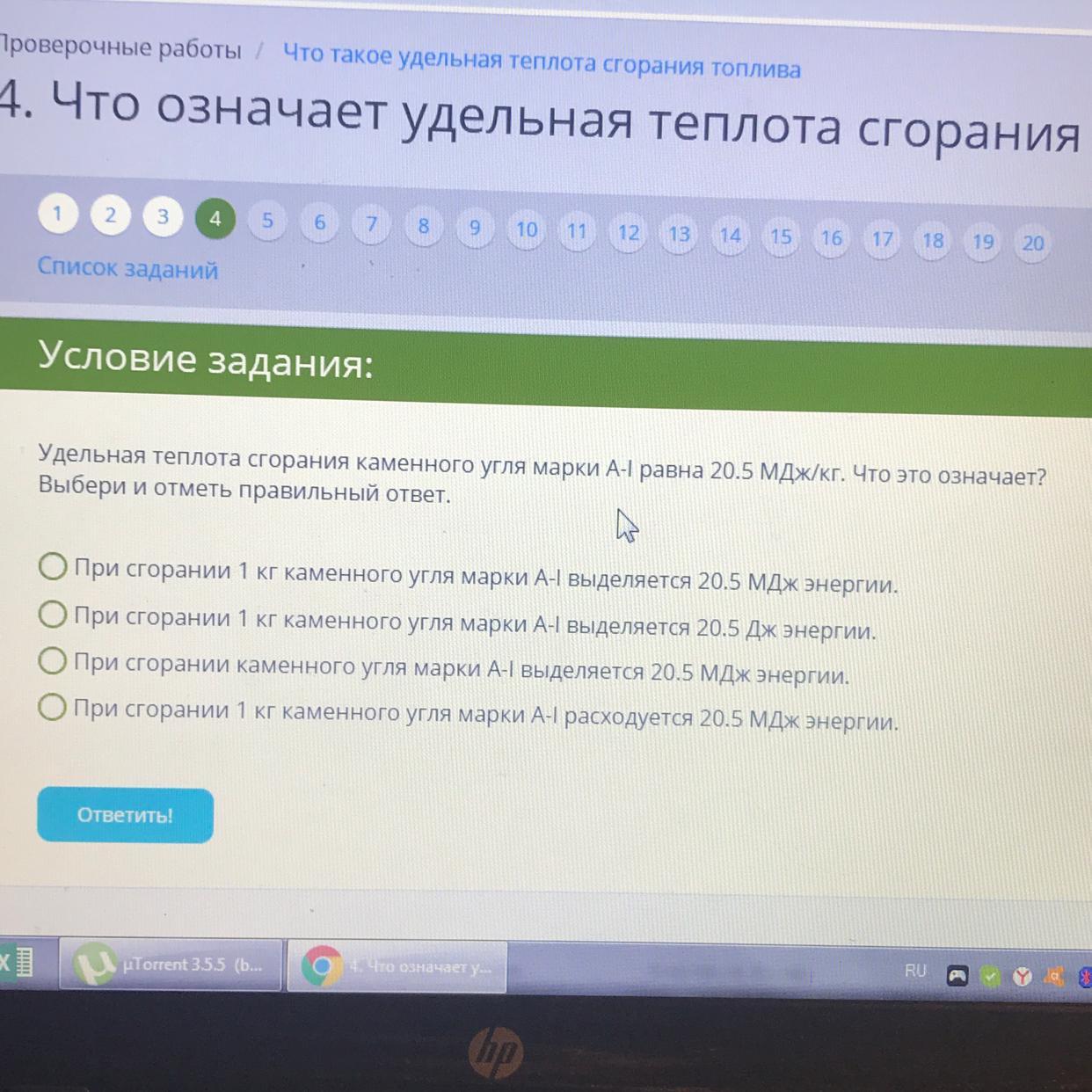 Удельная теплота сгорания каменного угля марки A- равна 20.5 МДж/кг. Что это означает?