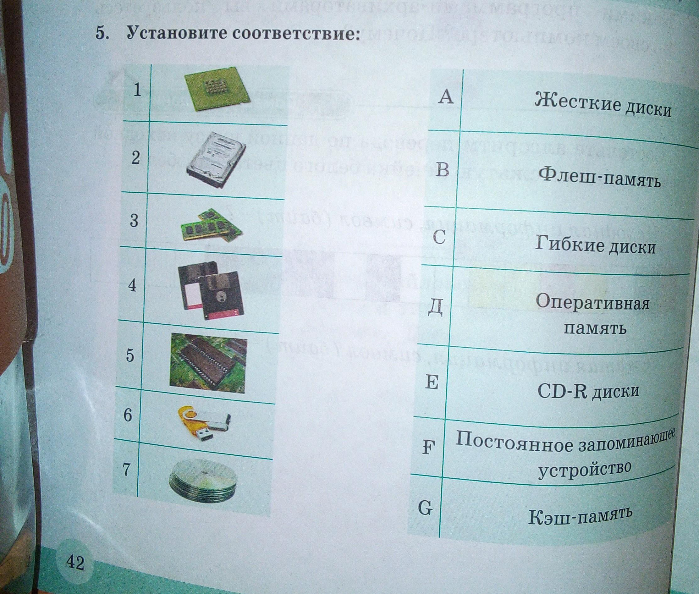 5. Установите соответствие: A Жесткие диски 1 В Флеш-память 2 C Гибкие диски 3 д Оперативная память 5 E CD-R диски 6 Постоянное запоминающее устройство 7 G Кэш-память