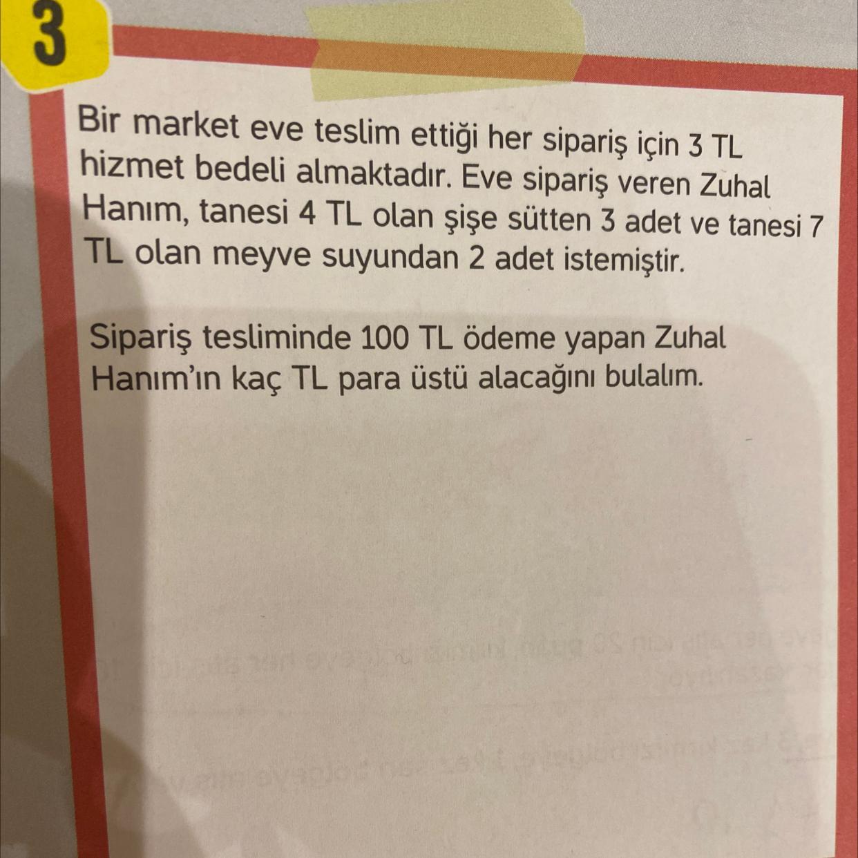 3 Продуктовый магазин взимает плату за обслуживание в размере 3 турецких лир за каждый заказ, доставленный на дом. Г-жа Зухал, разместившая заказ дома, попросила 3 бутылки молока стоимостью 4 турецких лиры и 2 фруктовых сока по 7 турецких лир каждая. Давайте выясним, сколько сдачи TL получит г-жа Зухал, которая платит 100 TL при доставке заказа.