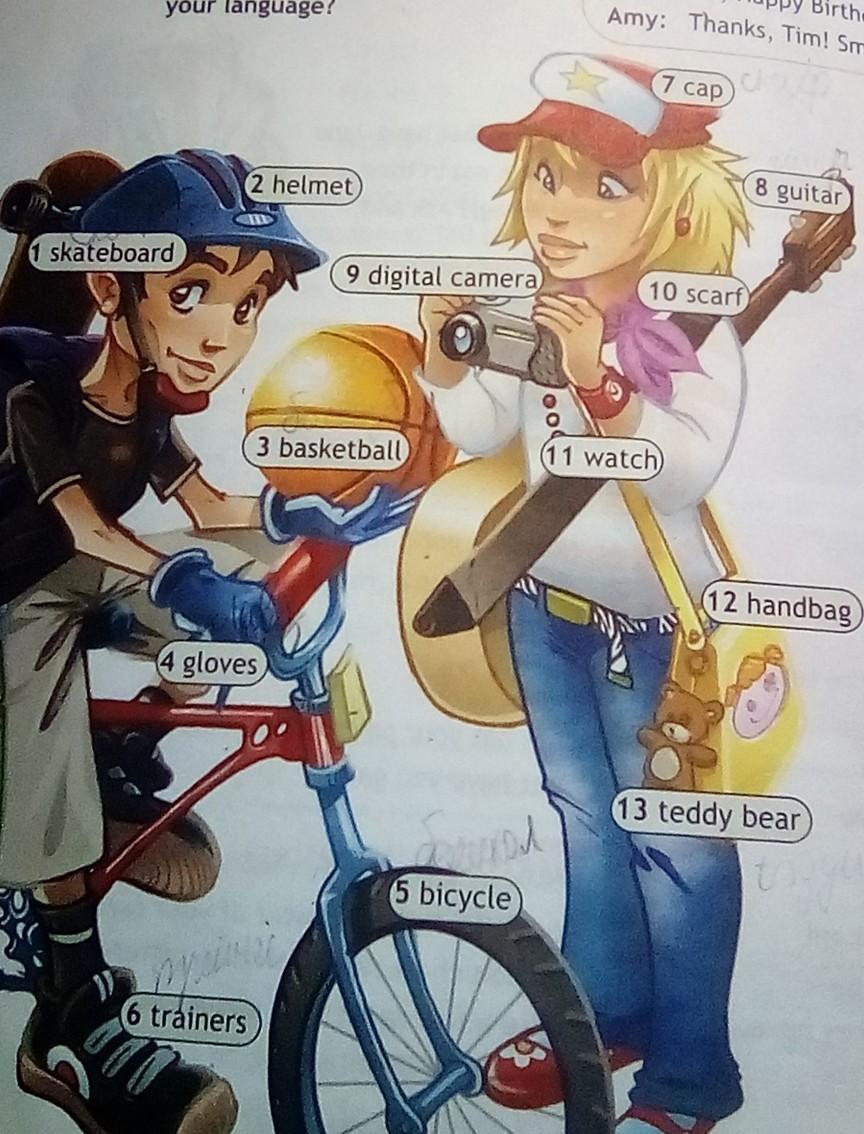 ,she has watch,digital camera,guitar and teddy bear.I have basketball, skateboard,bicycle and helmet.She wears scarf,jeans, cap and T-shirts.I wear trainers,gloves,socks, shirt and T-shirts.