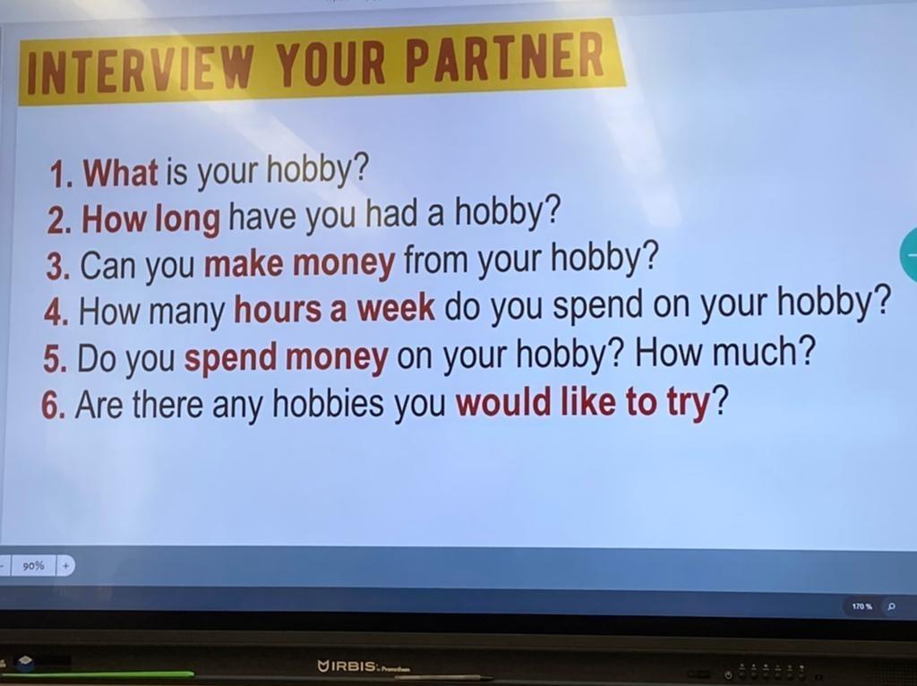 ИНТЕРВЬЮ С ВАШИМ ПАРТНЕРОМ 1. Какое у вас хобби? 2. Как давно у вас было хобби? 3. Можно ли зарабатывать деньги на своем хобби? 4. Сколько часов в неделю вы уделяете своему хобби? 5. Тратите ли вы деньги на свое хобби? Сколько? 6. Есть ли у вас хобби?