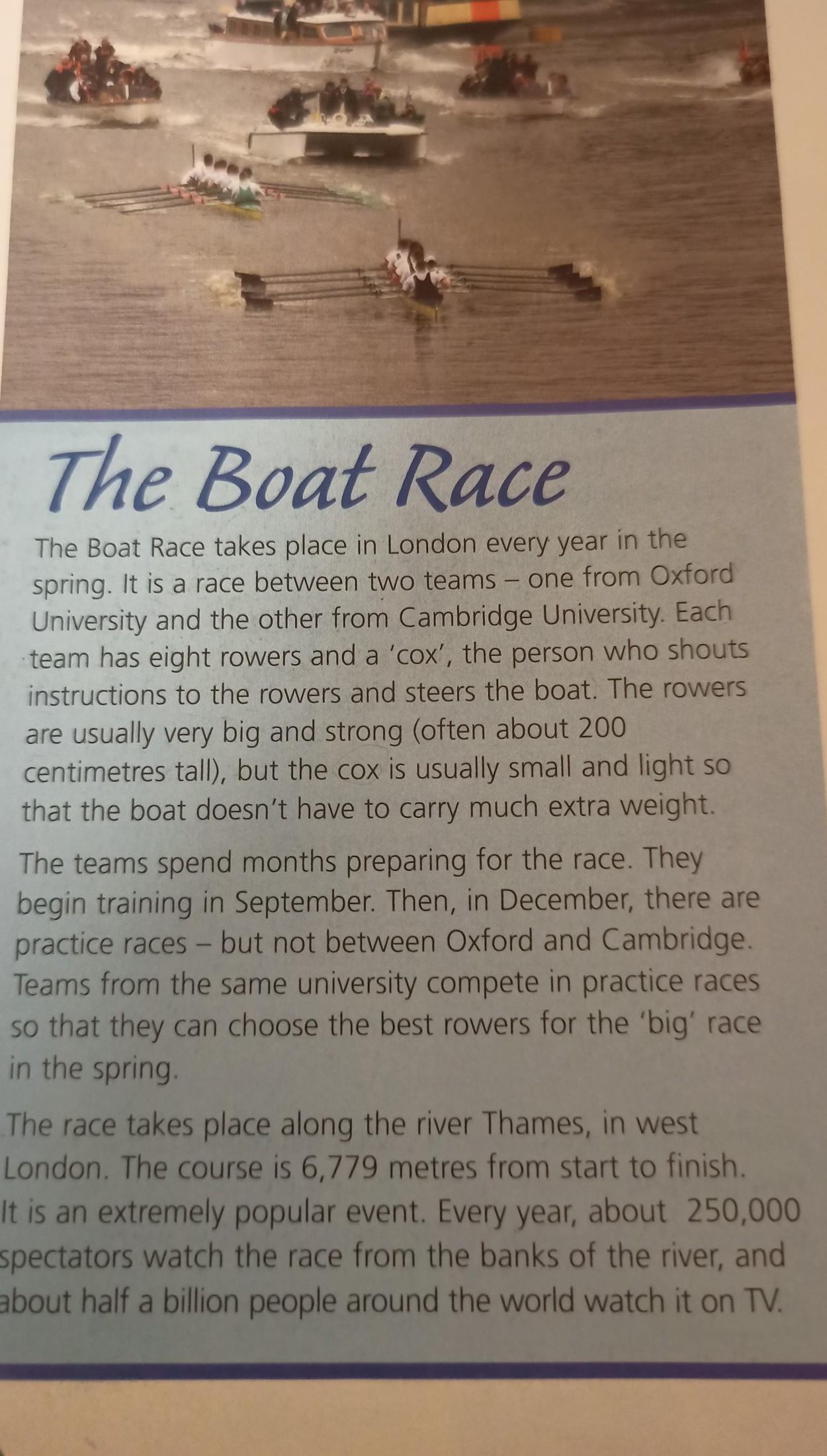 3)It is a race between two teams - one from Oxford University and the other from Cambridge University.