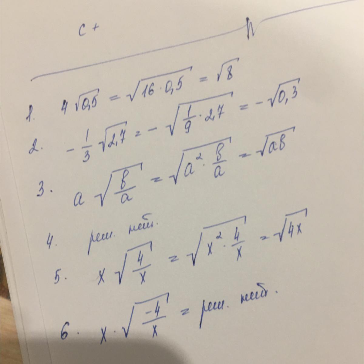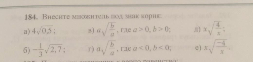 184. Внесите множитель под знак корня: а)4√0,5; б)-1/3√2,7; в)a√b/a, где a>0, b>0; г)a√b/a, где a<0, b<0; д)x√4/x; e)x√-4/x.