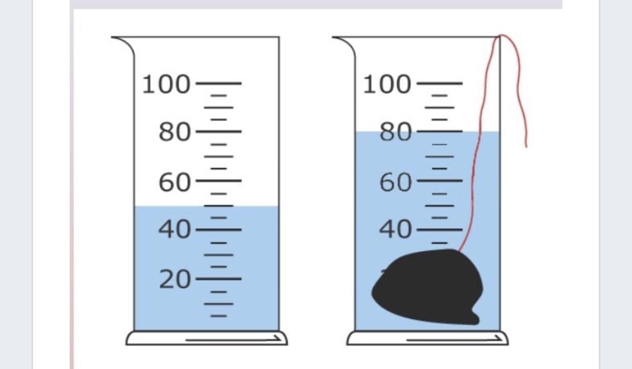 Для вычисления цены деления измерительного стакана делаем следующее. Берём соседние чёрточки с цыфрами и от большего значения отнимаем меньше после делим это число на количество чёрточек между эти двумя числами. К примеру : (60-40):4=5. А объем воды и тела просто вычисляем смотря на чёрточки.