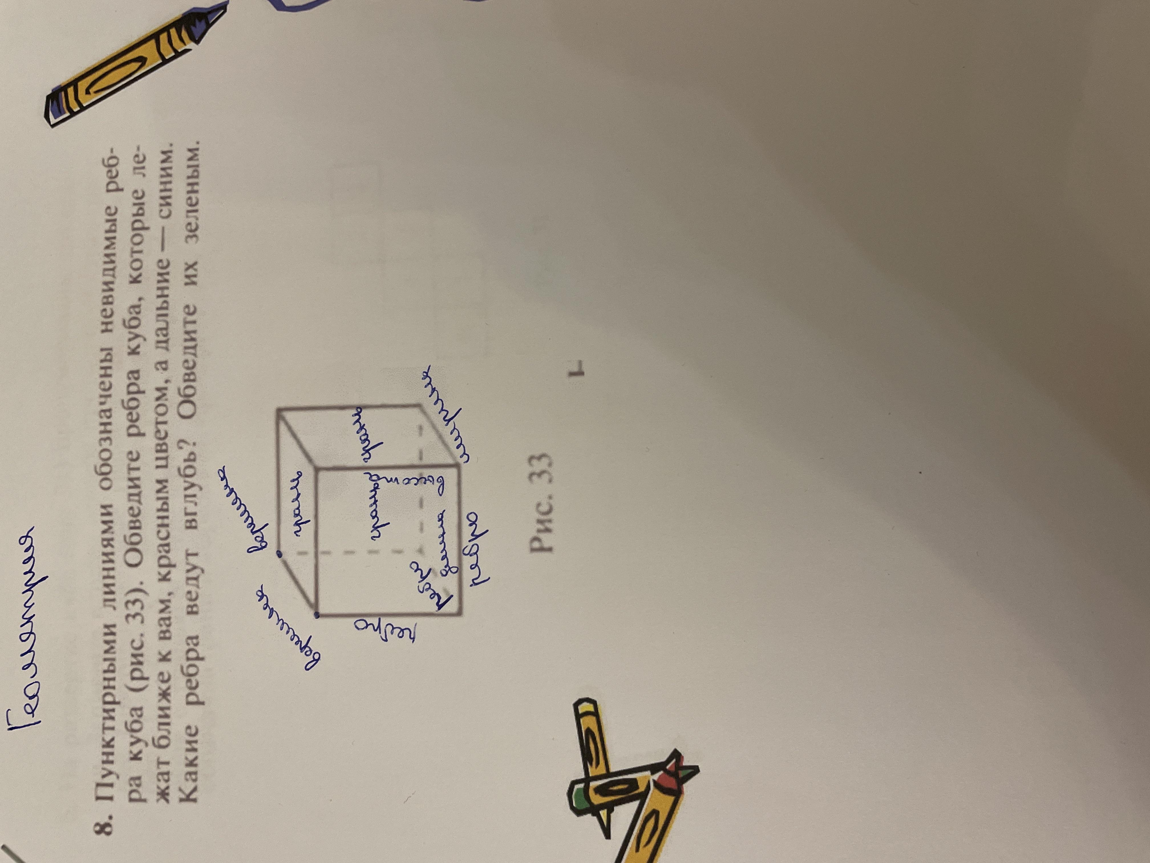 Пунктирными линиями обозначены невидимые рёбра куба, обведите рёбра куба, которые лежат ближе к вам красным, дальние синим, какие рёбра ведут вглубь? Обведите их зелёным.
