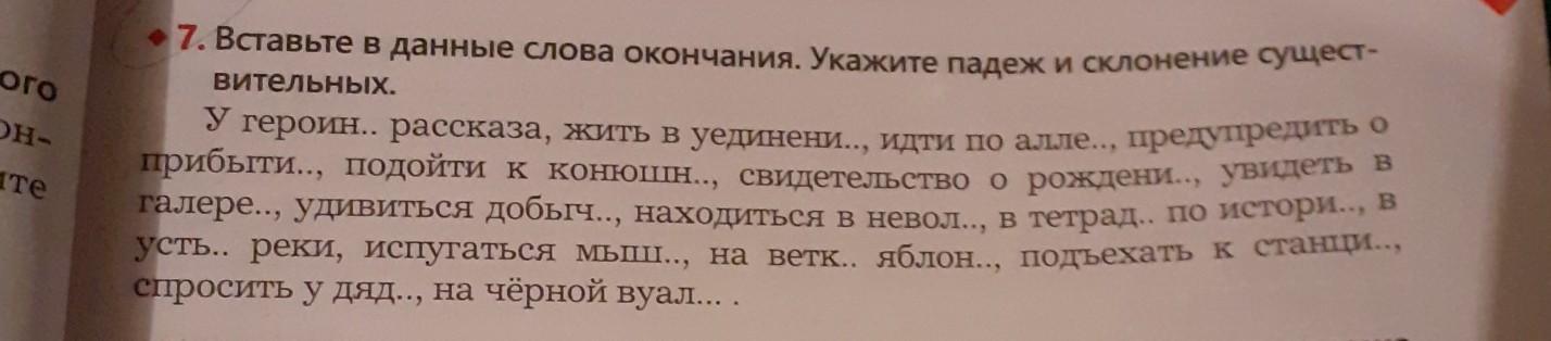 7. Вставьте в данные слова окончания. Укажите падеж и склонение сущест- У героин.. рассказа, жить в уединени... идти по алле.., предупредить о прибыти.., подойти к конюшн.., свидетельство о рождени.., увидеть в галере.., удивиться добыч.., находиться в невол... в тетрад. по истори.., в