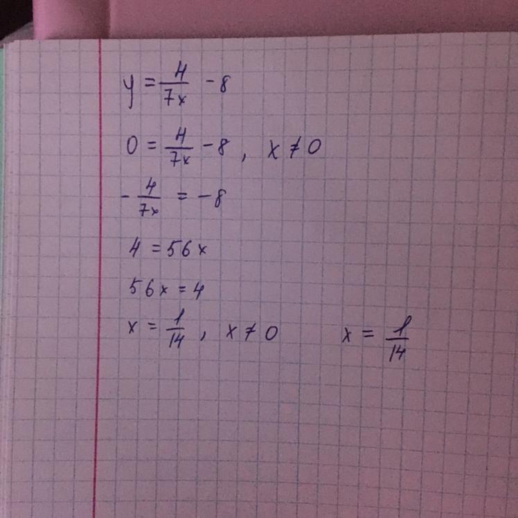Найдите координаты точки пересечения прямой: y = 4_7x - 8 с осью абсцисс. (там где нижняя черта - это дробь)