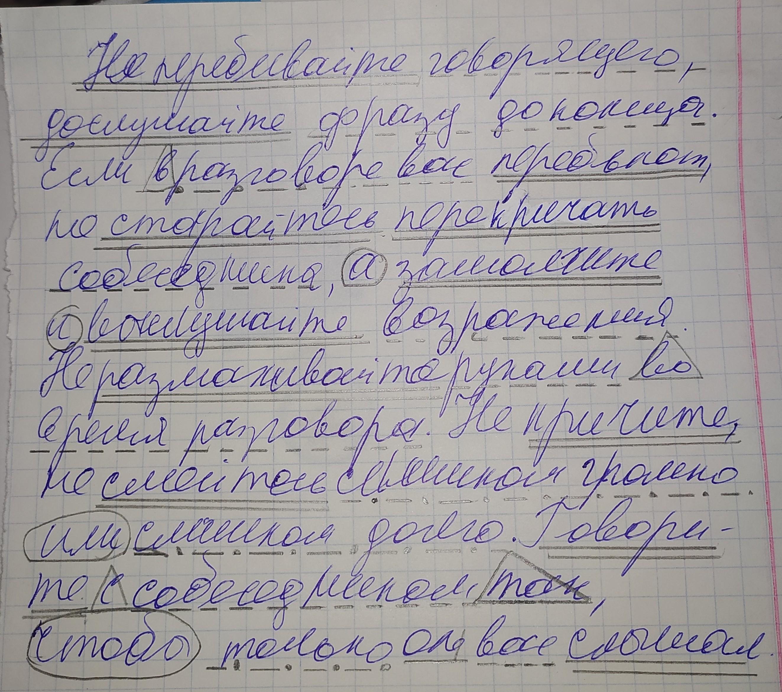 Подчеркнуть все члены предложения: Не перебивайте говорящего, дослушайте фразу до конца. Если в разговоре вас перебьют, не старайтесь перекричать собеседника, а замолчите и выслушайте возражения. Не размахивайте руками во время разговора. Не кричите, не смейтесь слишком громко или слишком долго. Говорите с собеседником так, чтобы только он вас слышал.