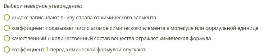 Неверное утверждение: Коэффициент показывает число атомов химического элемента в молекуле или в формульной единице