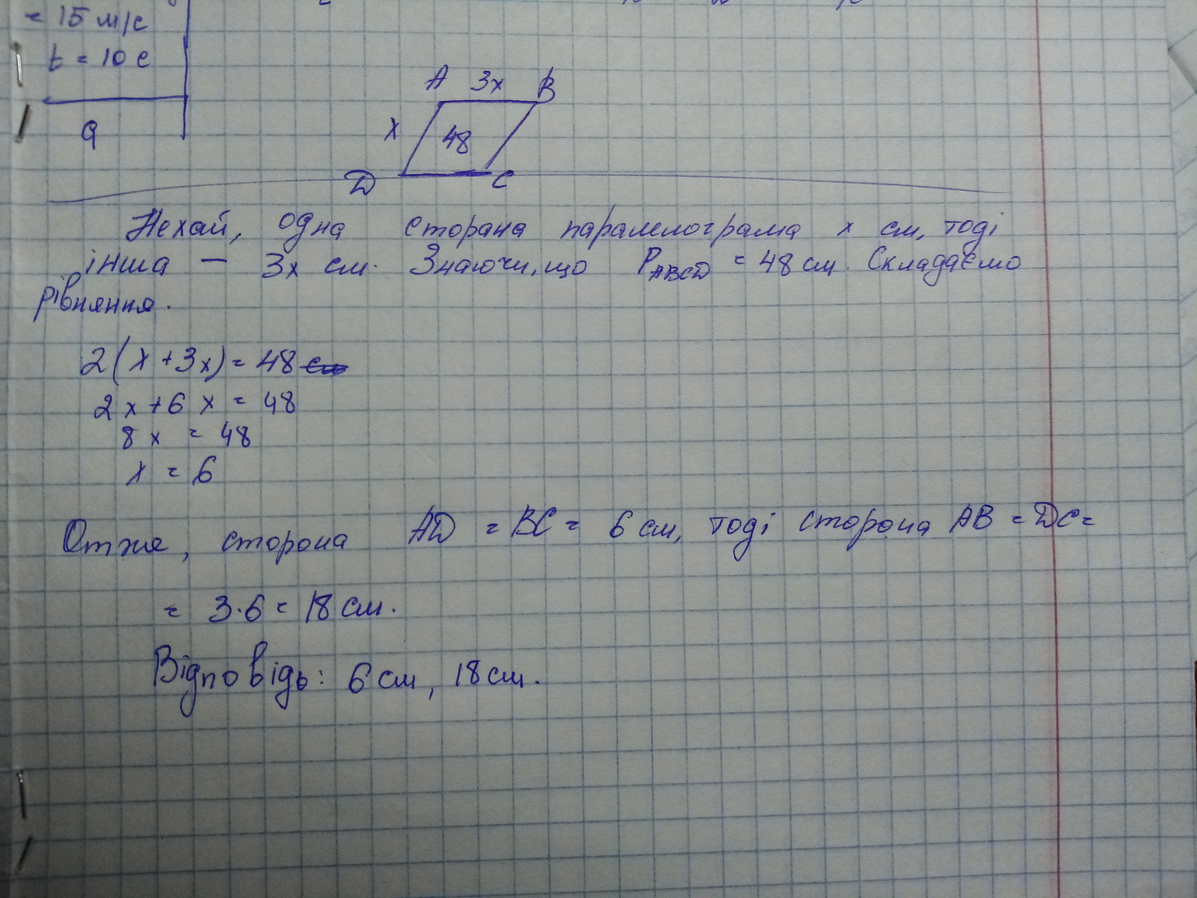 2. Периметр паралелограма дорівнює 48 см, а одна з його сторін в 3 рази більше від іншої. Знайдіть сторони паралелограма. Поможіть.