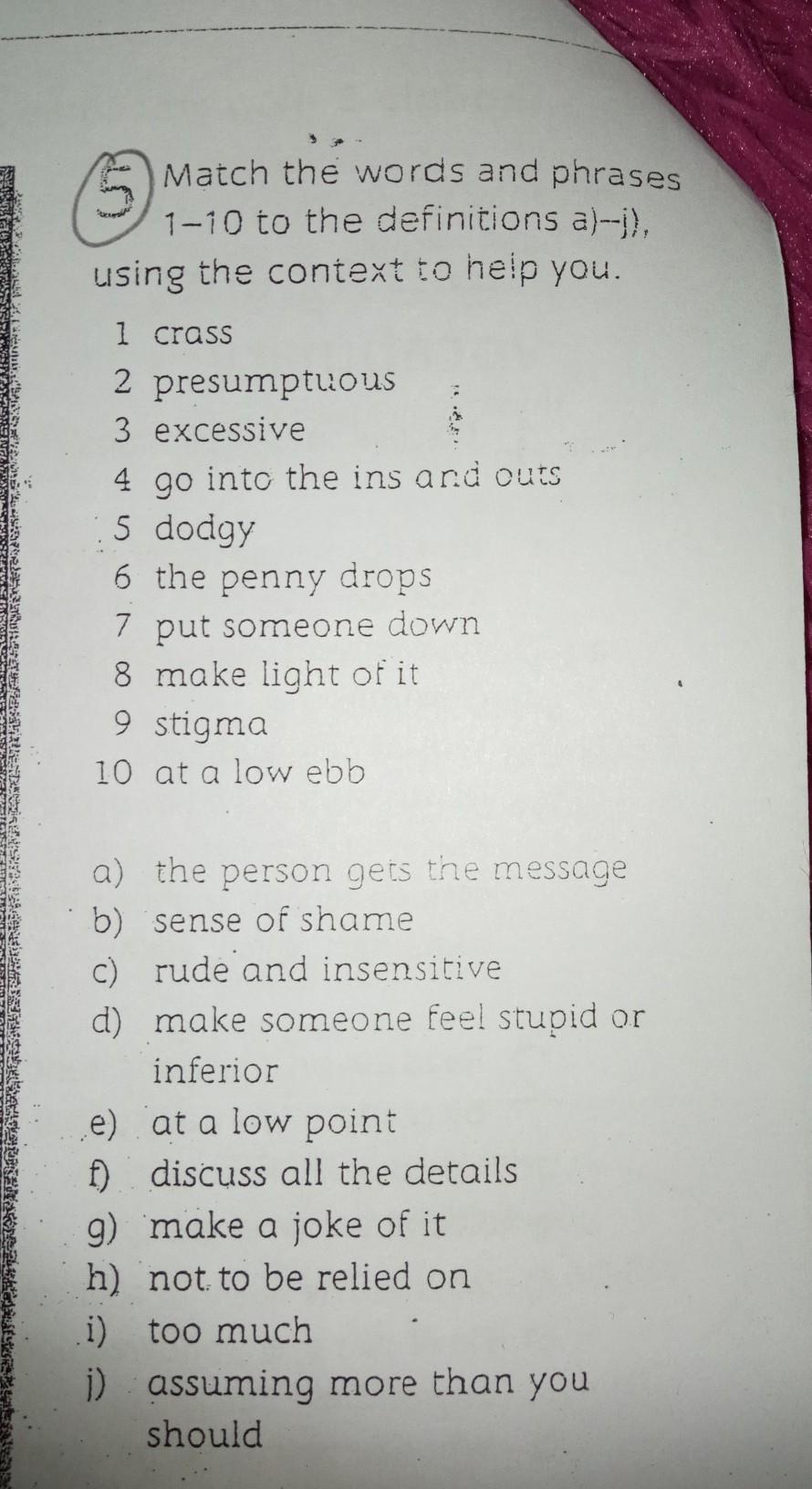 1 грубый 2 самонадеянный 3 чрезмерный 4 входить и выходить из строя 5 изворотливый 6 мелочь 7 опускать кого-то 8 пренебрегать этим 9 клеймо 10 на низком уровне а) человек понимает сообщение б) чувство стыда. в) грубый и бесчувственный г) заставить кого-то почувствовать себя глупым или неполноценным д) на низком уровне е) обсудить все детали г) пошутить над этим з) на что нельзя полагаться i) слишком много я) предполагать больше, чем следует