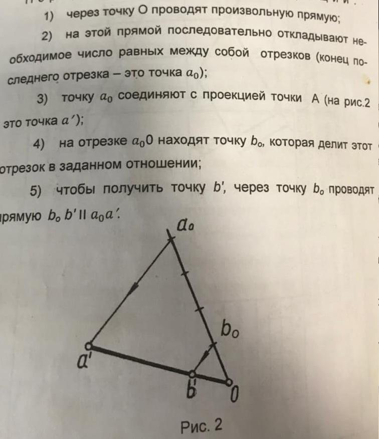 Для построения прямой АВ необходимо сначала по заданным координатам построить проекции точки А и провести проекции прямой АО. Чтобы найти точку В, надо разделить отрезок АО в заданном соотношении, используя теорему Фалеса(рис.2)
