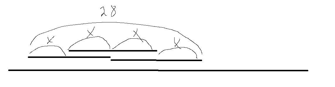 С 3.19. На прямой от одной точки в одном направлении отложены три равных отрезка так, что конец первого отрезка служит серединой второго, а конец второго серединой третьего. Длина отрезка, концами которого служат начало первого и конец третьего отрезка, равна 28 см. Найдите длину этих от резков.
