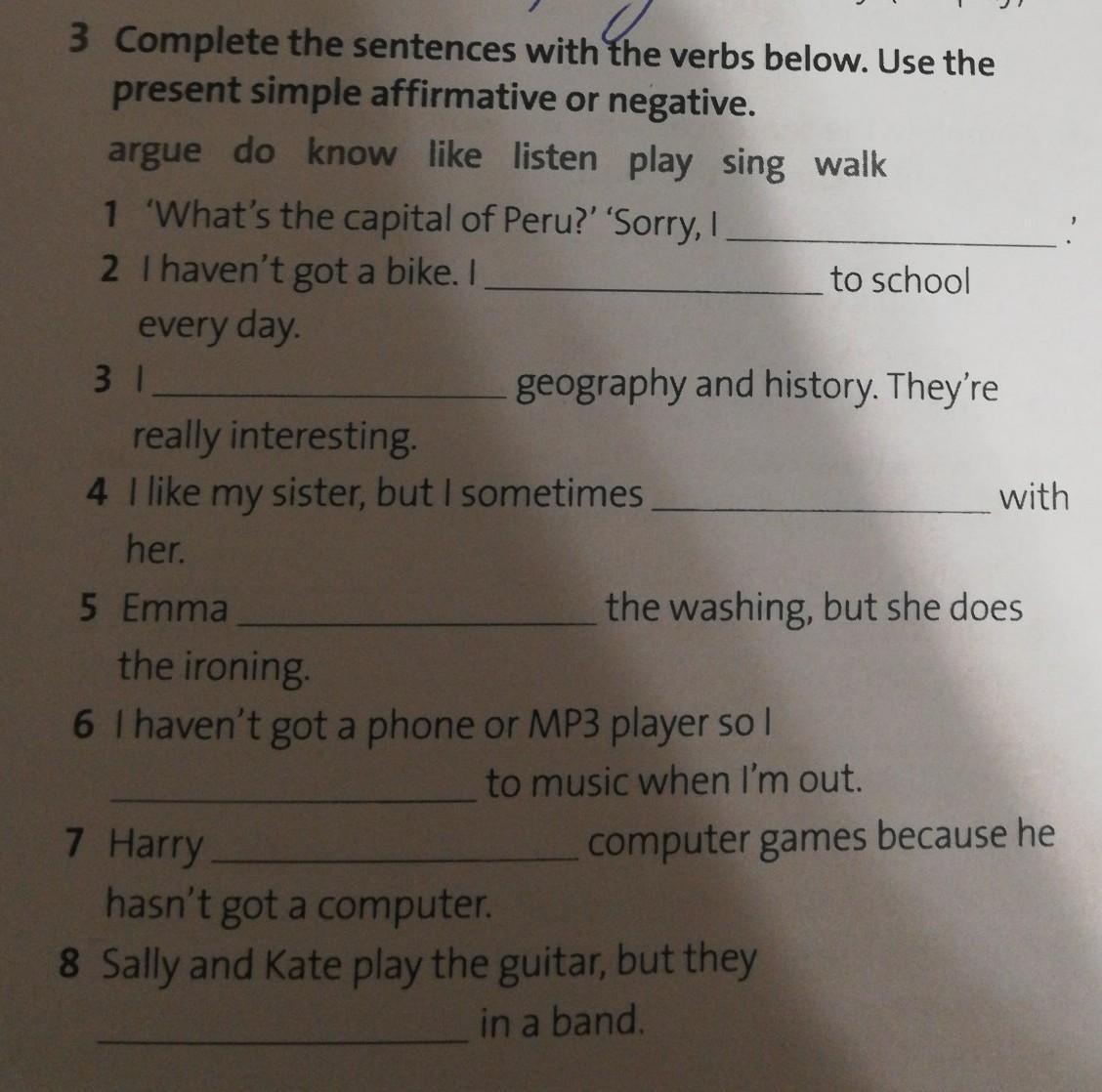 Ответ:1- i don't know. 2-walk, 3-like, 4- argue,5- don't do, 6- don't listen, 7 don't play,8don't sing