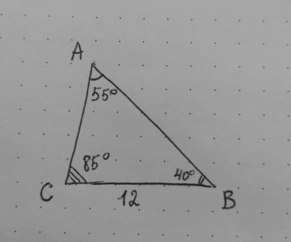 Найти AC, зная CB: sinA/CB = sinB/AC; AC = (CB×sinB)/sinA; AC = (12×sin40)/sin55