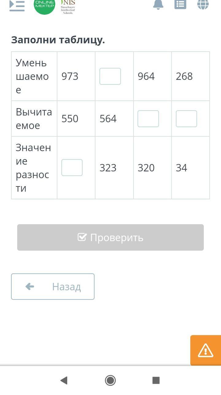 Заполни таблицу. Уменьшаемое 973 964 268 Вычитаемое 550 564 Значение разности 323 320 34 Назад Проверить