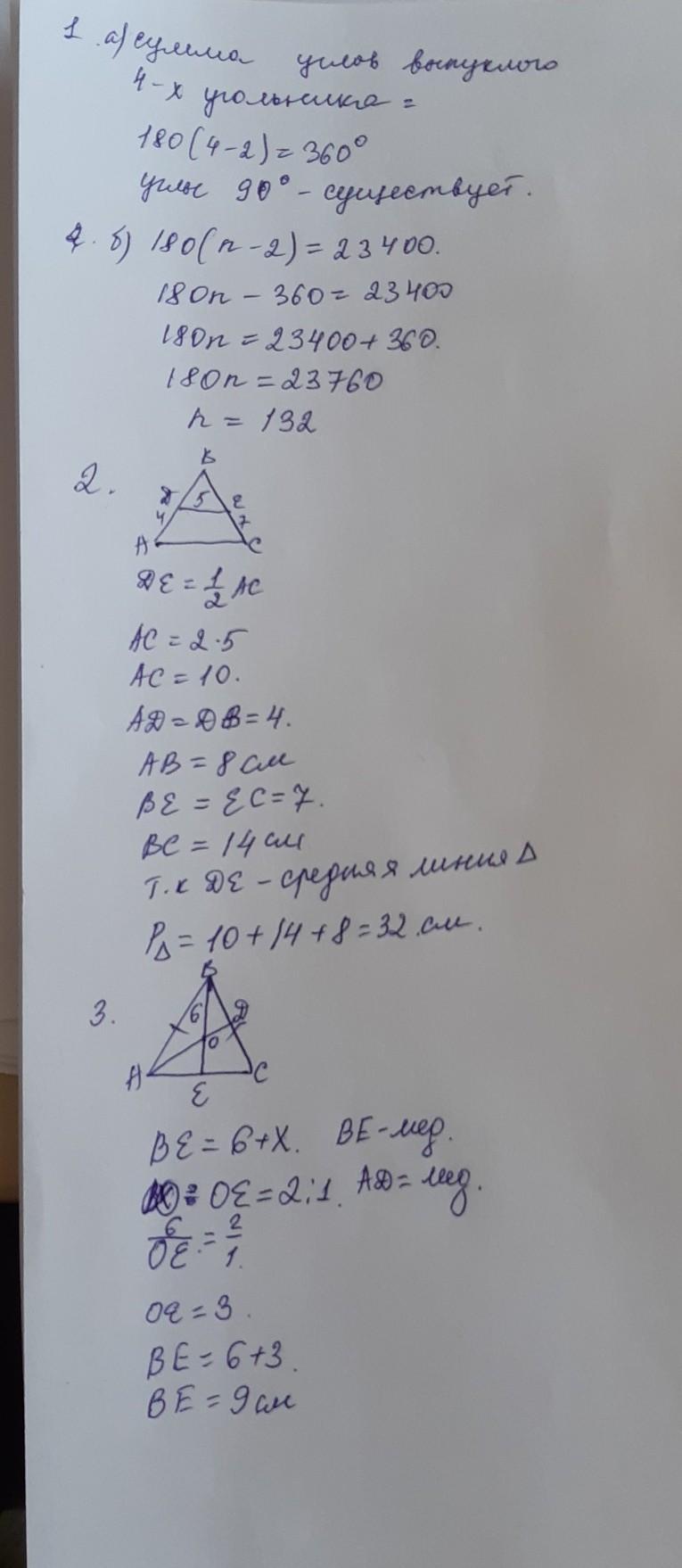 1 вариант Ответ обоснуйте. 1. а) Существует ли выпуклый четырехугольник, углы которого равны 90°,709,559, 1459. Б) Сколько сторон имеет выпуклый многоугольник, если сумма его углов равна 23400? 2. Средняя линия треугольника отсекает от него трапецию с боковыми сторонами 4 ми7 ми меньшим основанием 5 м. Найдите периметр треугольника. 3. В треугольнике ABC, AB = AC. Медиана к боковой стороне делит высоту, проведённую к основанию, на отрезки, больший из которых равен 6. Найдите длину этой высоты.
