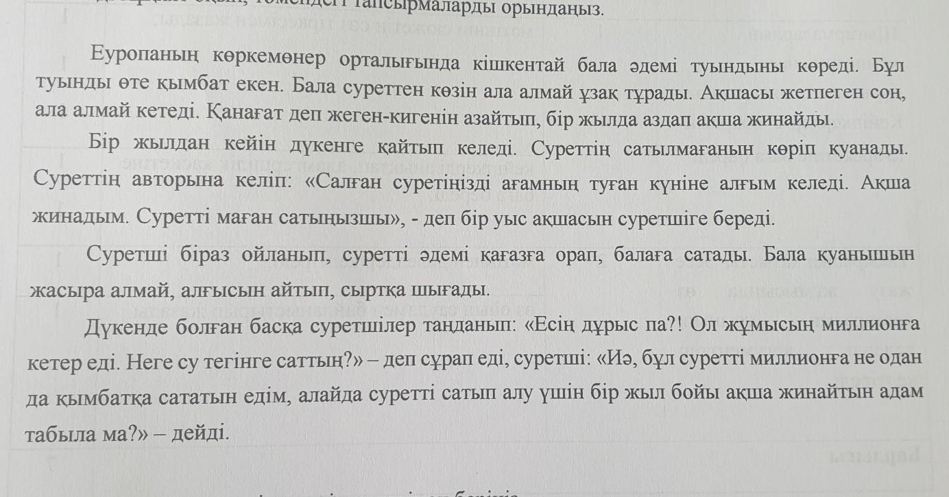 мәтіннің сюжеті сөз тіркестерімен беріңіз. Шешімі, дамуы,басталуы