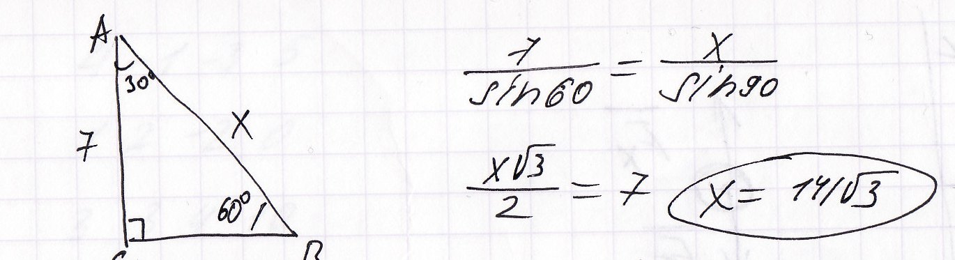 sin B=AC/AB=>AB=AC/sin B=7/sin 60 гр=7/(корень из 3/2)=14/корень из 3=14*корень из 3/3