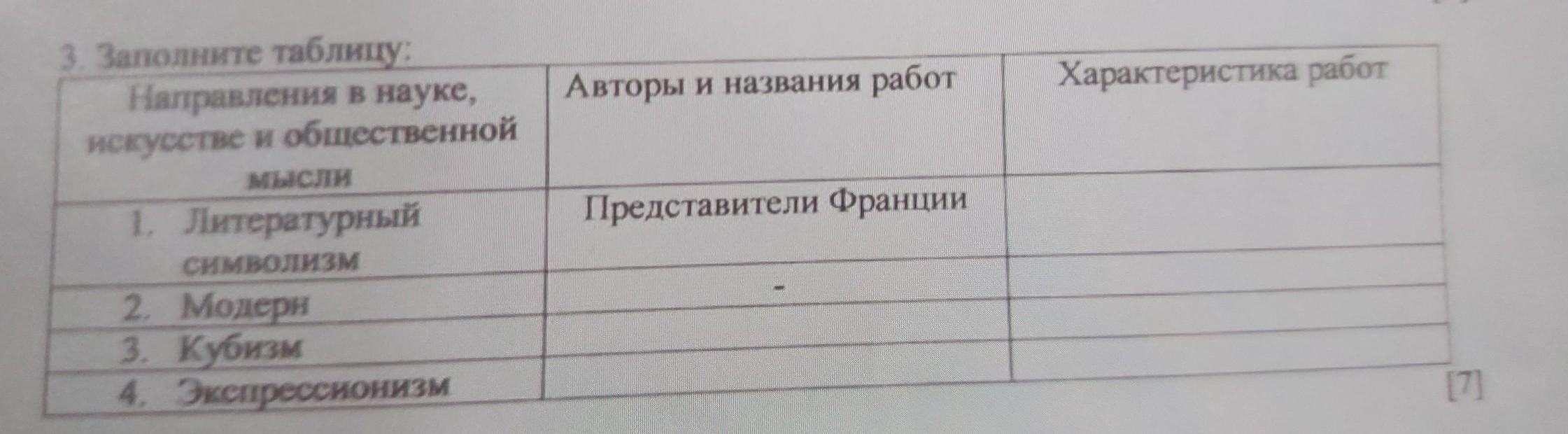 Авторы и названия работ Характеристика работ 3. Заполните таблицу: Направления в науке, искусстве и общественной мысли 1. Литературный Символизм 2. Модерн 3. Кубизм 4. Экспрессионизм Представители Франции 17]