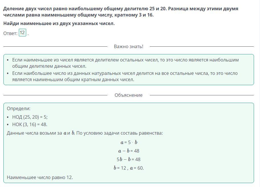 Деление двух чисел равно наибольшему общему делителю 25 и 20. Разница между этими двумя числами равна наименьшему общему числу, кратному 3 и 16. Найди наименьшее из двух указанных чисел.