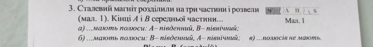 Сталевий магніт розділили на три частини і розвели (мал. 1). Кінці А В середньої частини...